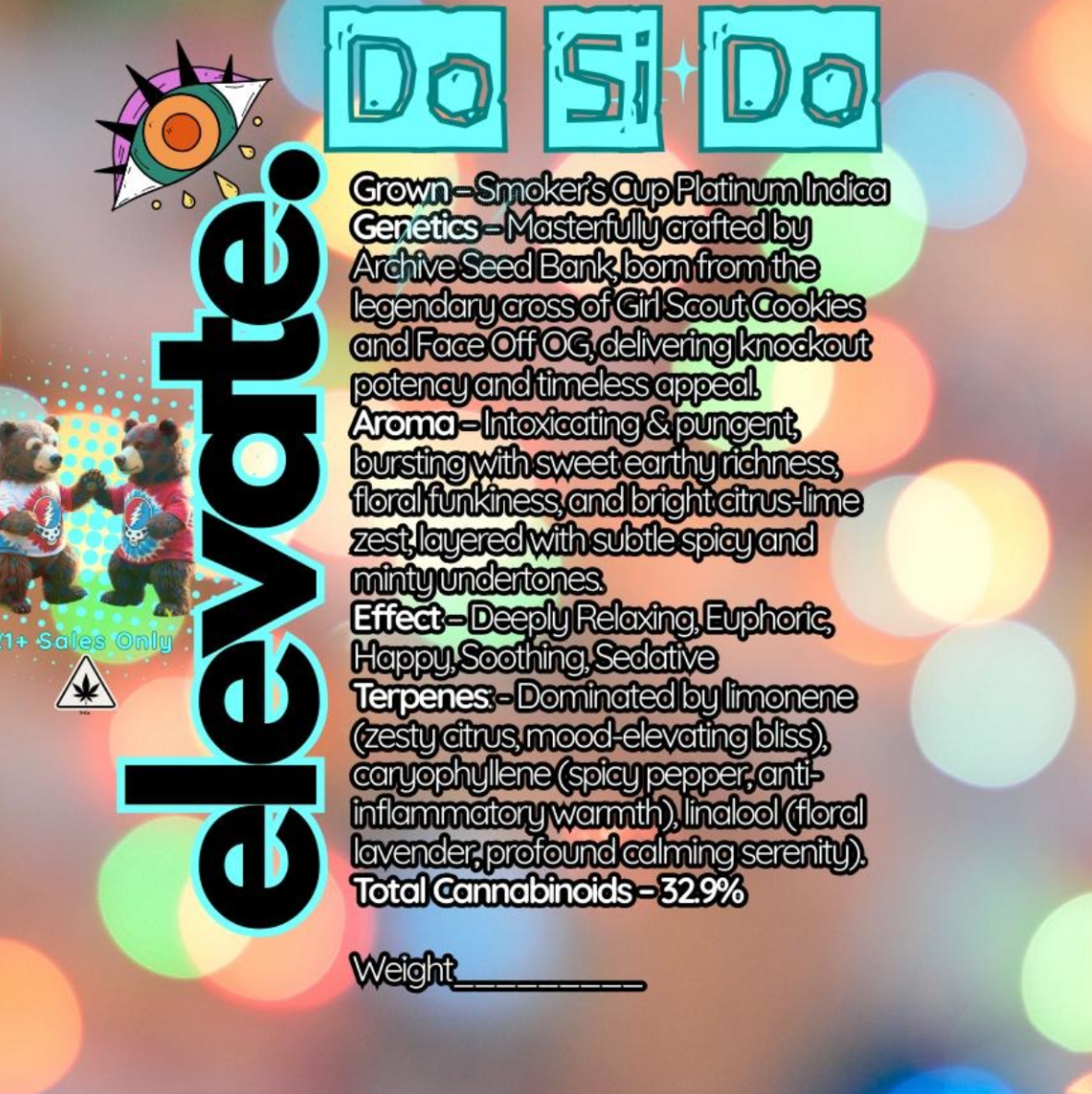 Elevate. Do Si Do, Smoker's Cup Platinum Indica — straight from the wizardry of Archive Seed Bank This one's a heavyweight championship belt made of Girl Scout Cookies × Face Off OG — pure knockout royalty in bud form. Aroma? Imagine your nostrils throwing a citrus rave: zesty limes and bright lemon drop explosions crash into sweet cookie-dough earthiness, then get sprinkled with floral funk, a whisper of pepper spice, and a cool minty breeze that says "relax, fam... we're going deep." Feels like: Couch? Locked. Mind? Floating somewhere between a happy giggle and pure cosmic serenity. Body? Melted into warm lavender-scented pudding. Mood? Euphoria on repeat with a side of "everything is beautiful forever." 32.9% Total Cannabinoids.
