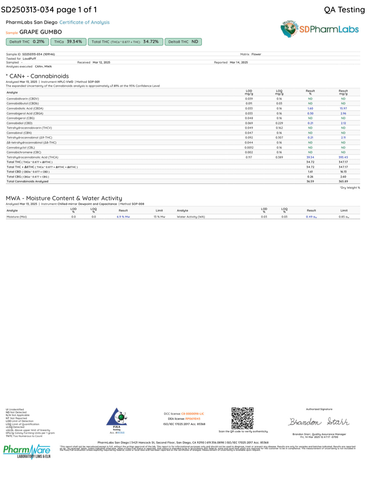 Grape Gumbo is a Platinum Hybrid masterpiece that delivers a fruity explosion of flavor and effect. Expect an intoxicating aroma of juicy purple grape, sweet bubblegum candy, and ripe berry jam layered with earthy spice and a hint of funk. The experience unfolds from uplifting euphoria into giggly bliss, then settles into a soothing body melt—making it the ultimate all-day companion. Packed with 39.3% cannabinoids and a dynamic terpene profile featuring limonene, myrcene, and caryophyllene, this Smoker's Cup royalty is dangerously delicious. Stir up the pot and let the purple vibes elevate your soul.