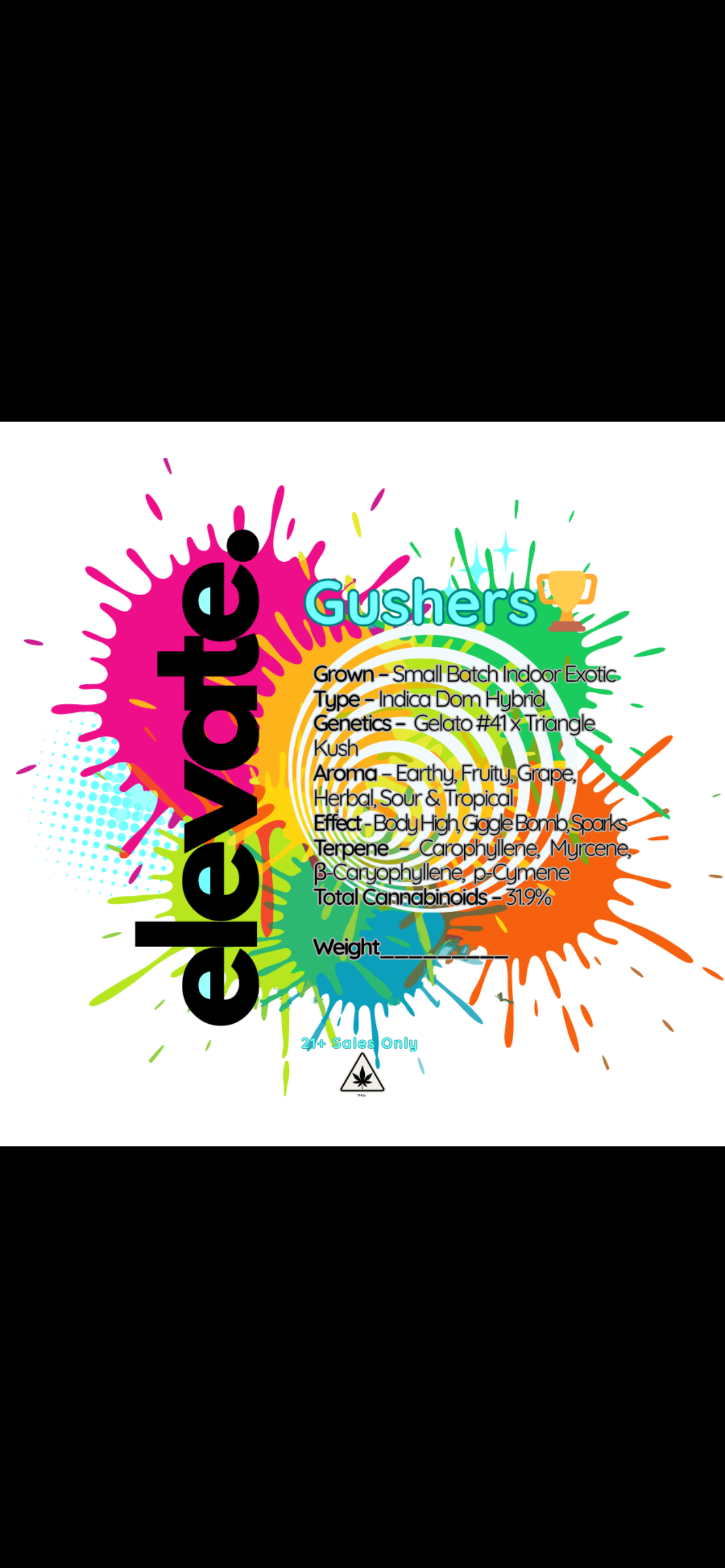 "Indulge in the ultimate high with Smokers Cup Gushers THCa Flower. Exotically grown in small batches, this indica-dominant hybrid delivers a playful punch of fruity and sour flavors, paired with a giggly body high. Featuring a unique blend of Gelato #41 and Triangle Kush genetics, this strain packs a potent punch of 31.99% total cannabinoids. Light up and join the exclusive club of smokers cup winners."