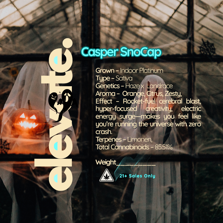 "Experience a cosmic high like no other with Casper Snocaps Elite Tier Sativa THCa Flower. This strain packs a rocket fuel cerebral blast that sparks hyper focused creativity and an electric energy surge without the crash. Its sharp citrus and pine aroma will electrify your senses, while dominant terpinolene terpenes and a whopping 84.51% THCa guarantee a spicy, woody, and citrusy experience. Get ready to run the universe with zero crash!"